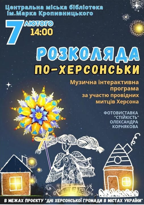 Друзі! Запрошуємо вас 7 лютого о 14:00 на музичну інтерактивну програмау провідних митців Херсона. Це особлива культурна подія, присвячена давній українській традиції Розколяди-обрядовому прощанню з різдвяно-новорічним циклом свят.